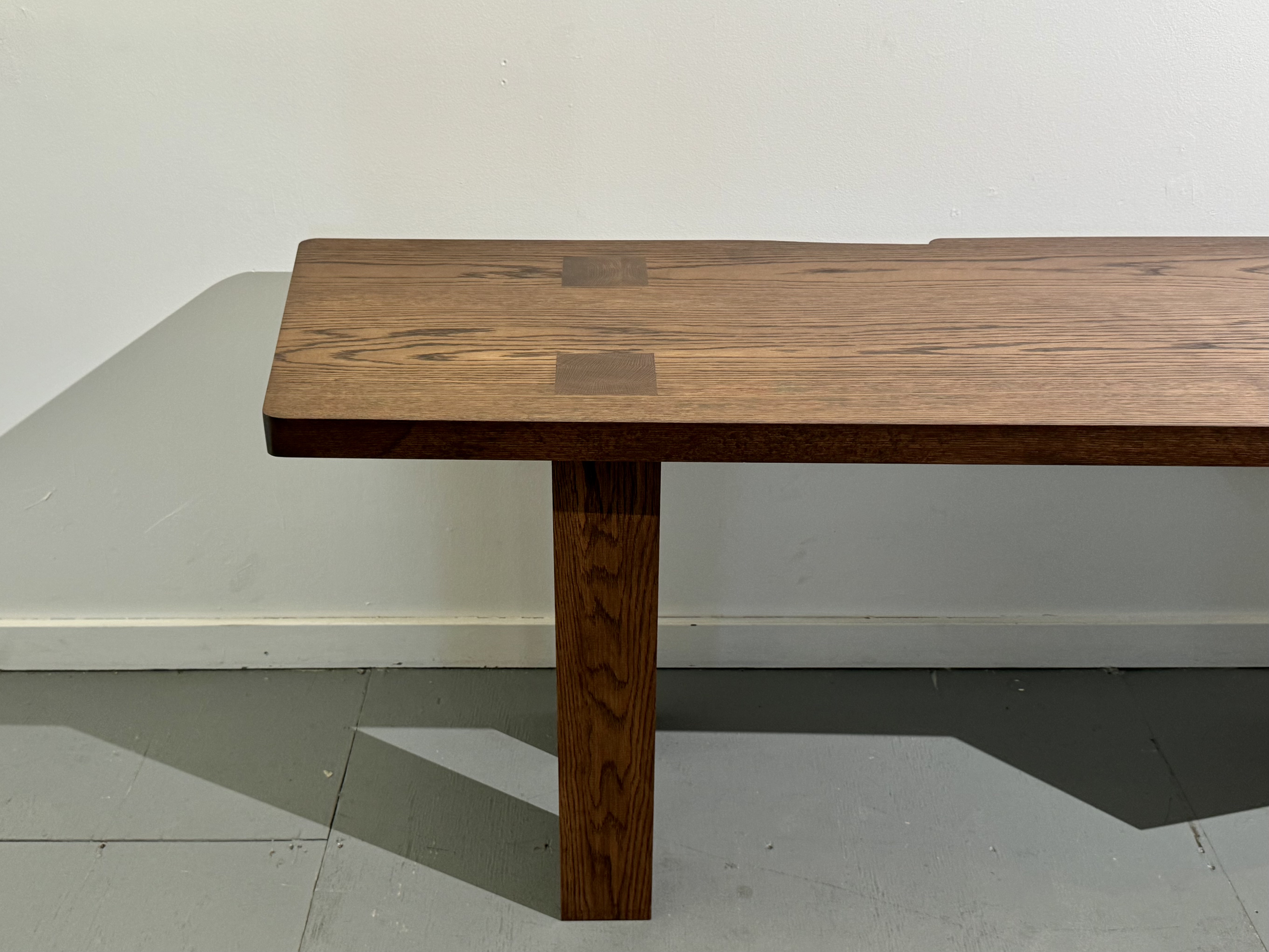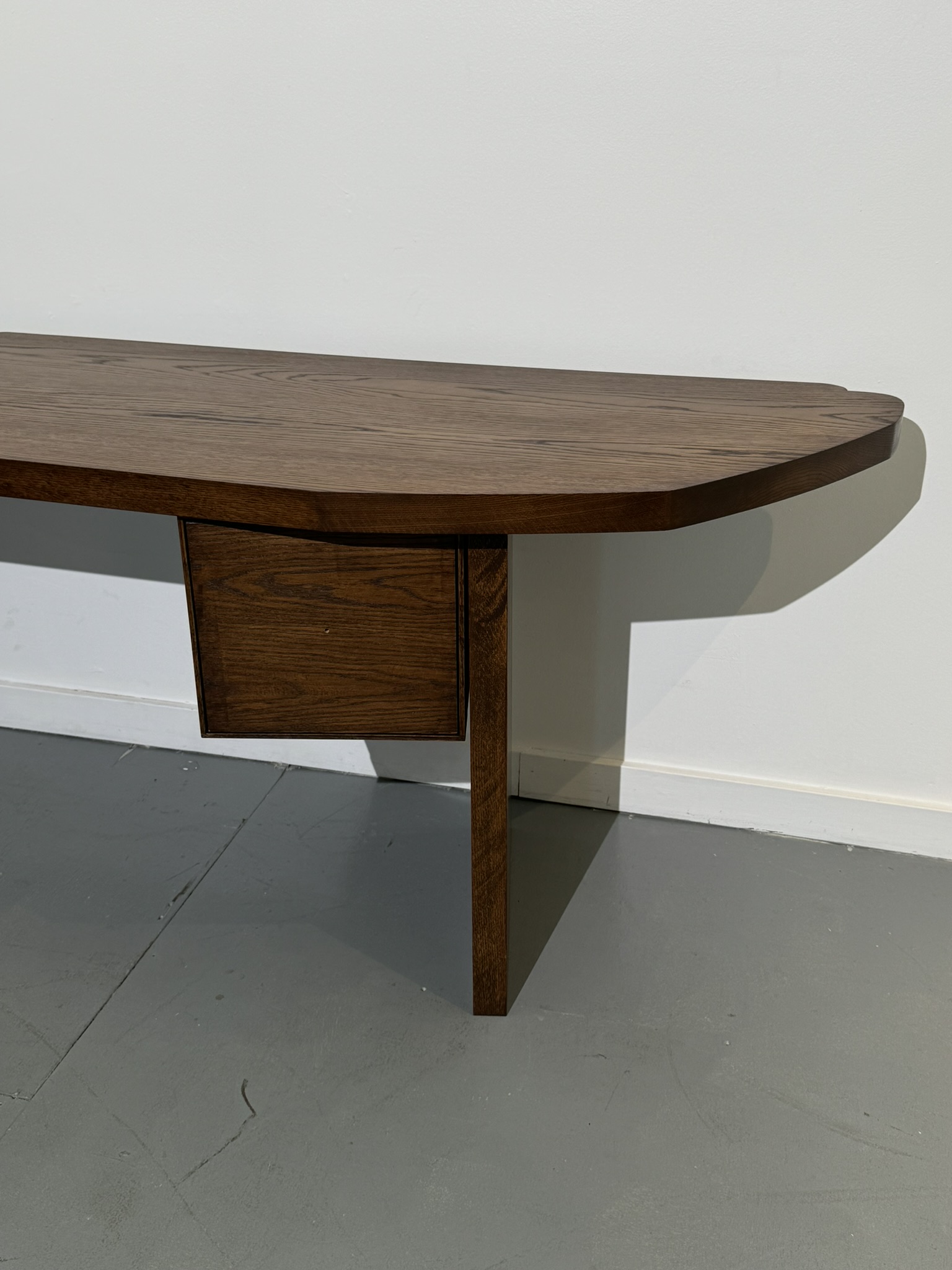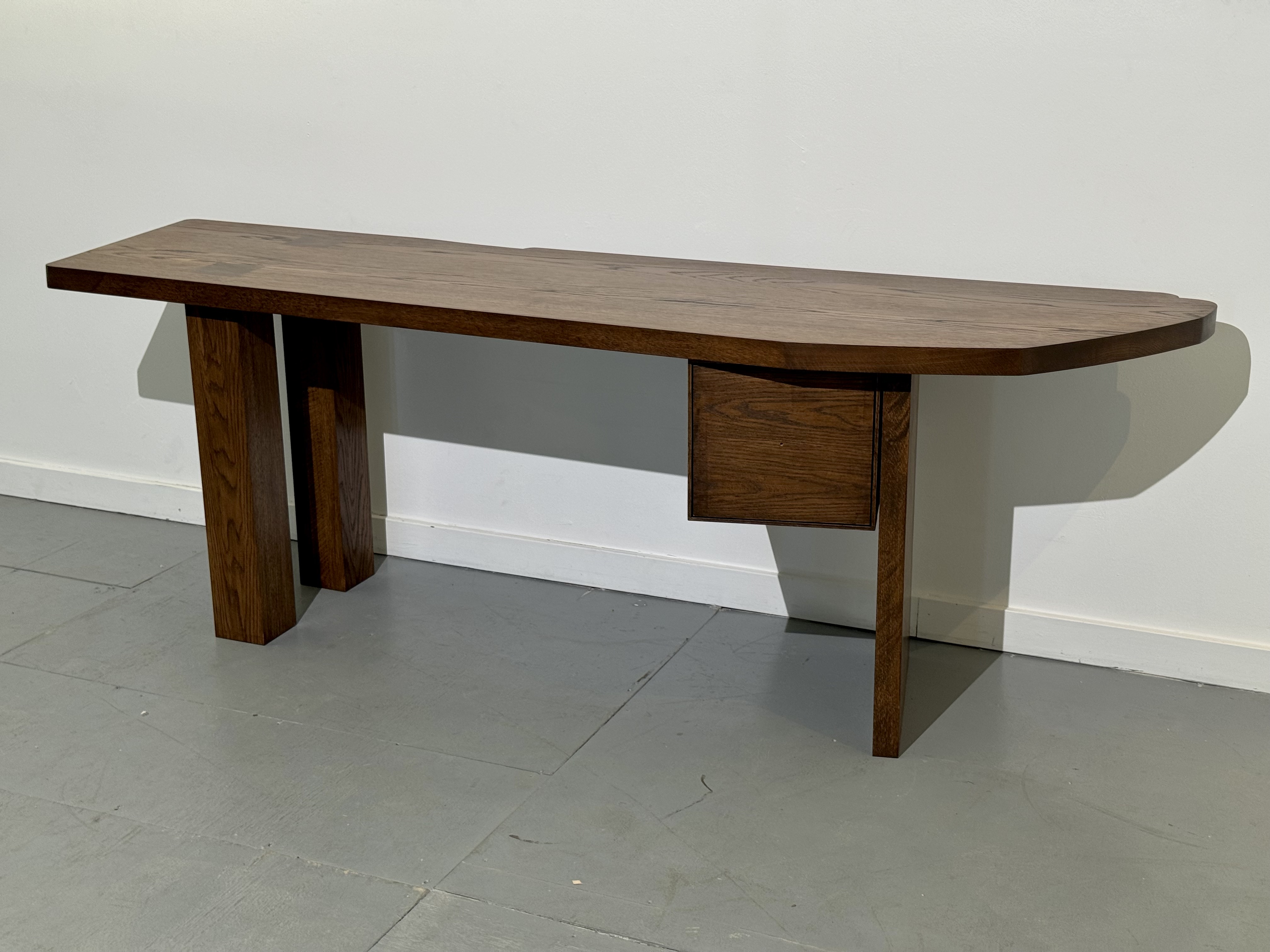A desk for client with hardwood drawer. The drawer box is detachable and can serve as storage. Made from oak with walnut stain.